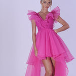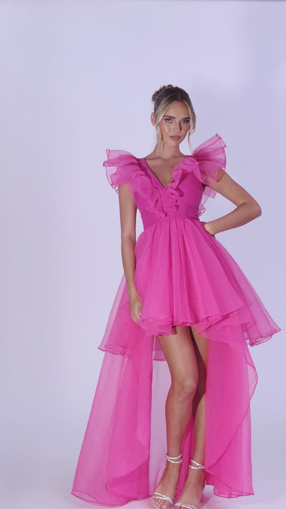 Step into sparkling elegance with this glitter organza dress, featuring a flattering V neckline and delicate sheer flounce ruffle sleeves for a touch of romance. The structured bodice, complete with built-in bust cups, is beautifully contrasted by an open V back with a charming tie-back strap. The hi-lo skirt showcases a playful silhouette with a shorter lining underneath, creating graceful movement and eye-catching appeal. Fully lined and finished with an invisible back zip closure, this dress is perfect for special occasions where you want to shine with effortless style.