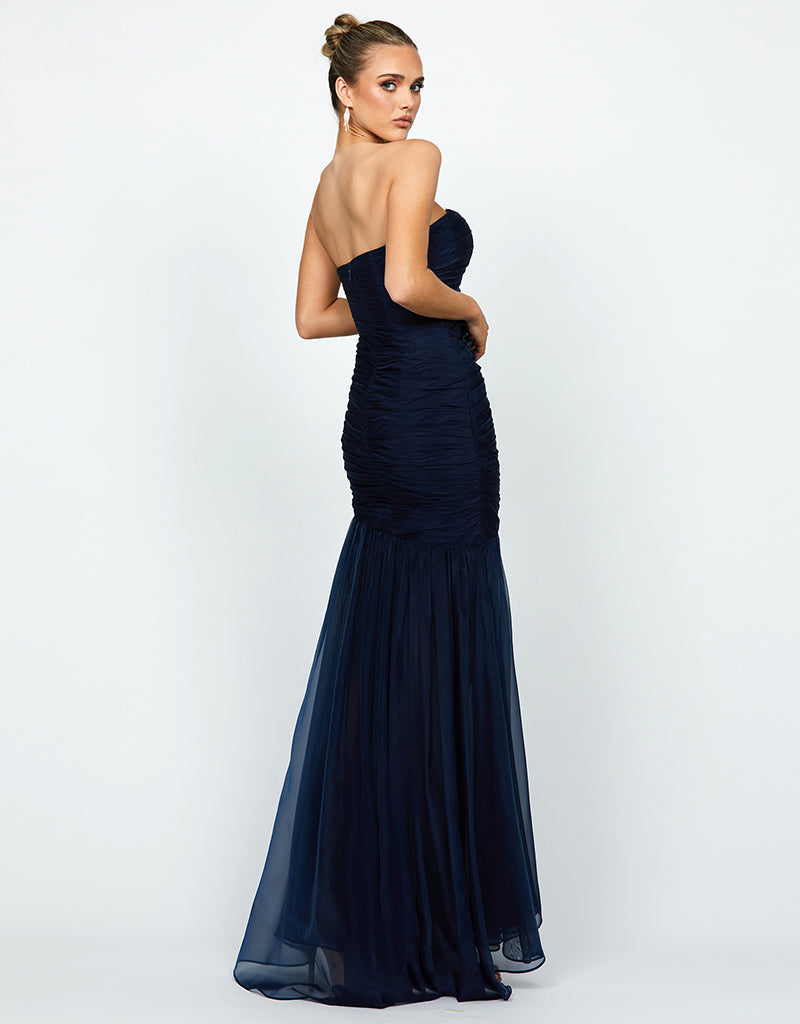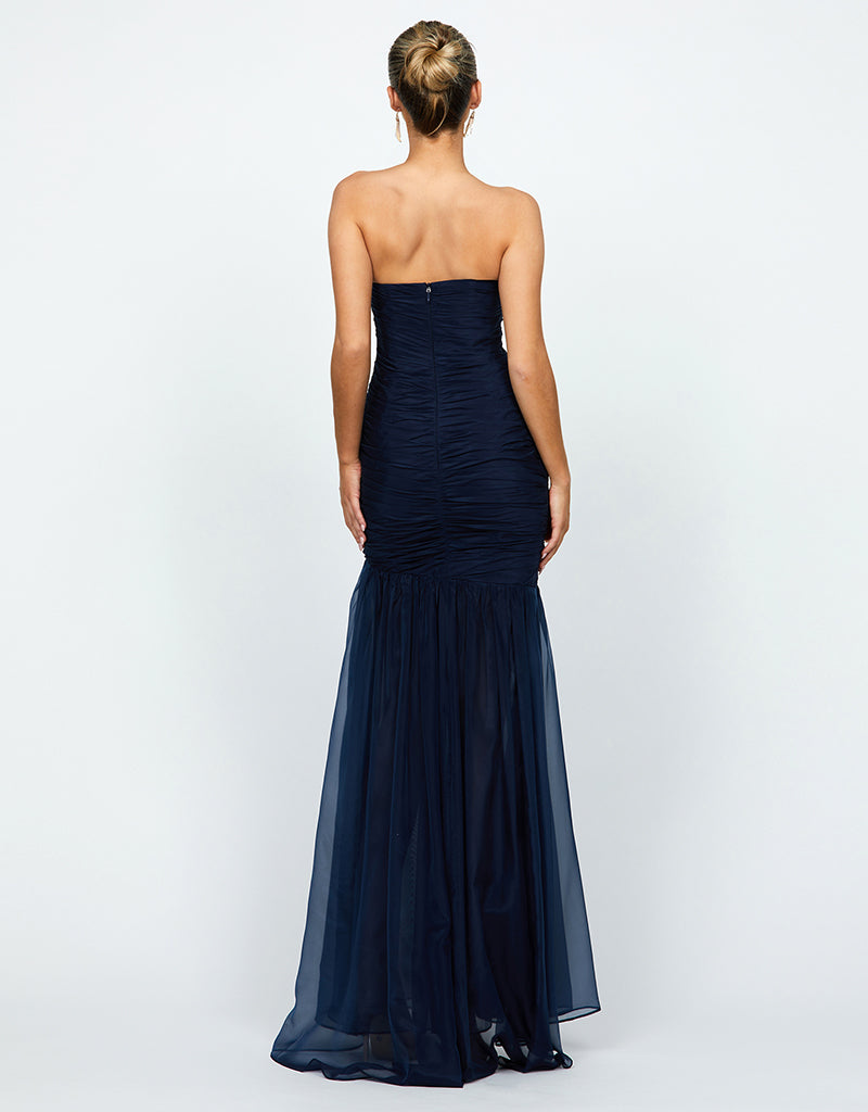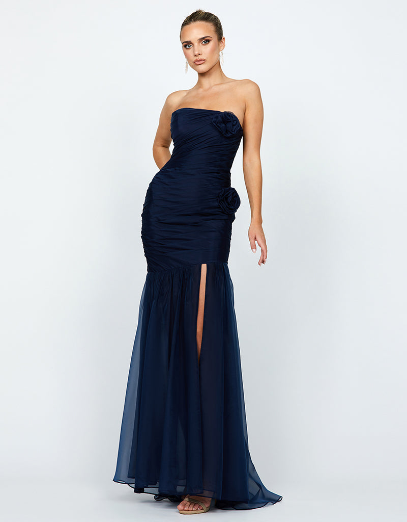 Step into elegance with our NEVAEH GATHERED ORGANZA GOWN featuring a straight-across neckline and delicate front rosette features. Built-in bust cups provide support, complemented by asymmetric allover gathering that enhances the flattering silhouette. The gathered fishtail skirt panel includes a front side split for graceful movement and allure. Complete with an invisible zip closure at the back, this gown ensures a seamless fit. Fully lined throughout the body and partially in the skirt, it offers comfort and a refined finish. Ideal for formal events or special occasions, this gown promises sophistication and timeless beauty with every detail.