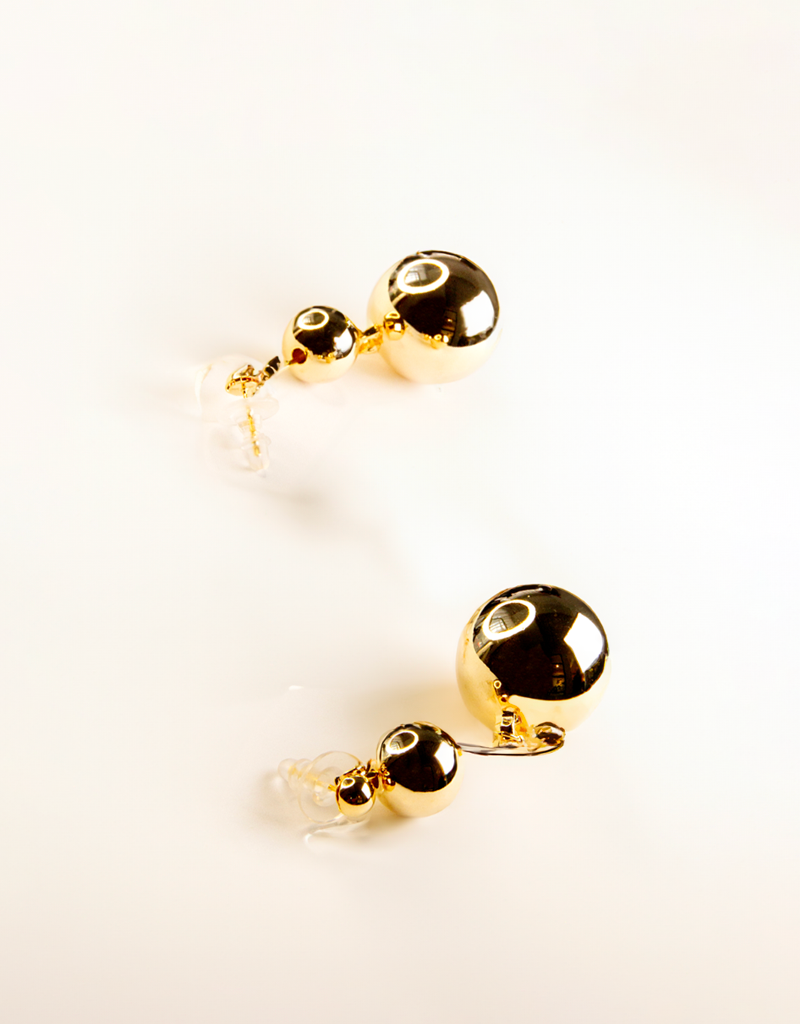 These stunning earrings feature smooth, dangling double spheres that capture light beautifully. The gold-tone plating adds a touch of luxury and sophistication, making these earrings perfect for any occasion.